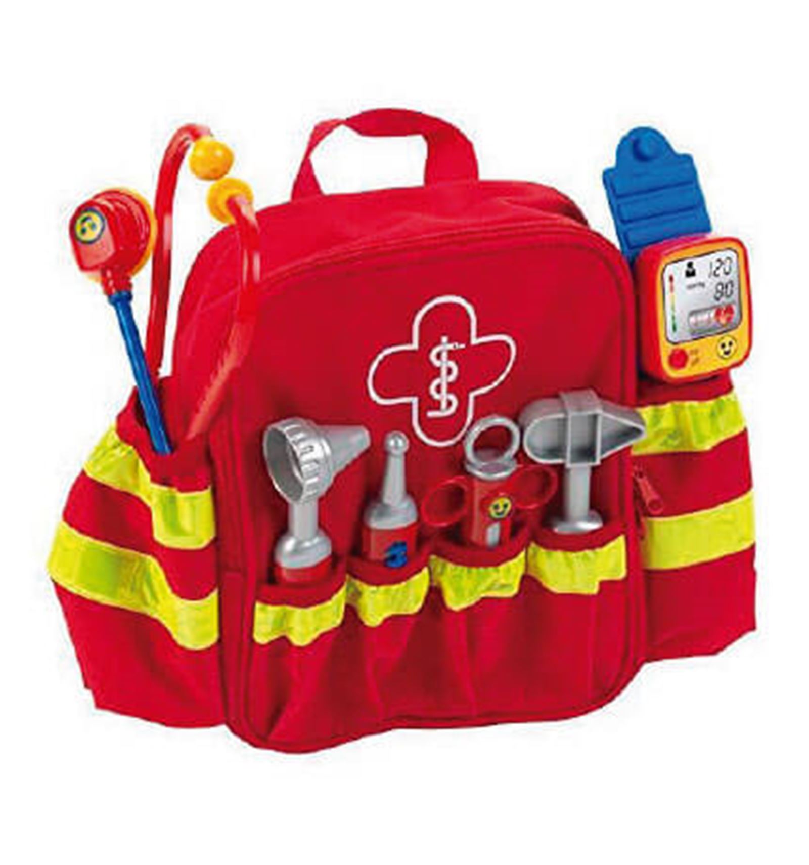 Mochila de rescate Mochila con correa para el hombro ajustable (máx. 44.5 cm de longitud) Bolsillos exteriores elásticos: 2 a los lados y 4 en la parte frontal Gran abertura con cremallera para una fácil carga y descarga. Tejido exterior robusto con elementos reflectantes. 100% poliéster, lavado a mano. Dimensiones de la mochila aprox. H / W / D: 24 / 32.5 / 8cm - Adecuado para niños mayores de 3 años Accesorios incluidos (juguetes): - Esfigmomanómetro electrónico con sonido - estetoscopio - Espejos para oídos - termómetro - Jeringa - martillo de reflejos - Adecuado para niños mayores de 3 años Advertencia: ¡ATENCIÓN! NO ES ADECUADO PARA NIÑOS MENORES DE 3 AÑOS. Contiene piezas pequeñas y/o piezas que pueden desprenderse, que por ejemplo, podrían ser tragadas. Peligro de asfixia. Contiene partes con tubos, cuerdas, cintas, etc. Peligro de estrangulación. Conserve la dirección y la información. Nota Juguete de imitación.