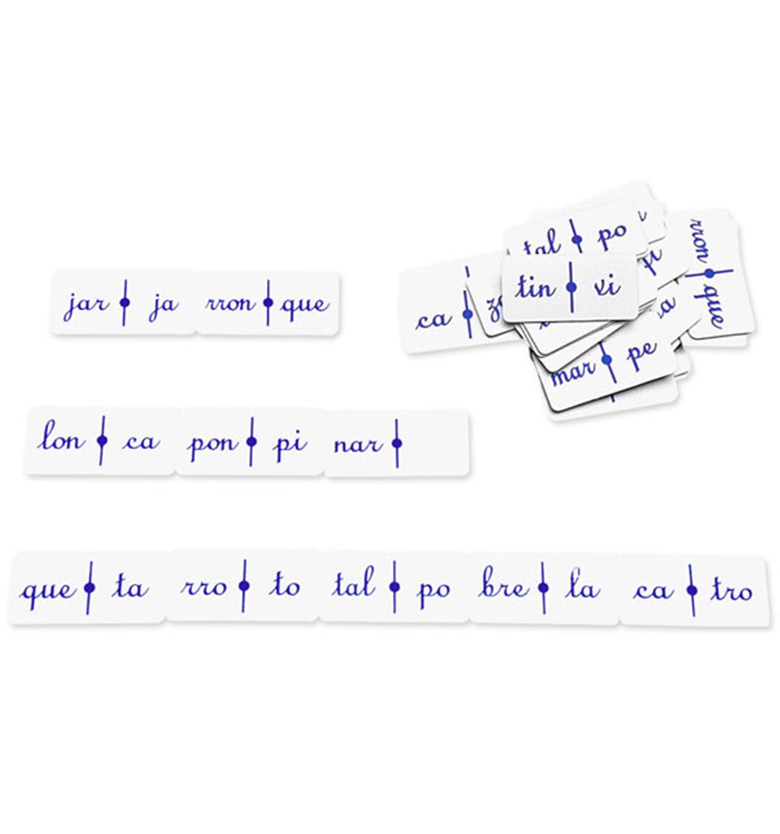 Permite la composición de más de 300 palabras (Dominó 2) y 400 palabras (Dominó 1), relacionadas en la guía, con la utilización de sílabas simples en Dominó 1 más las complejas en el 2. Material: 48 fichas de plástico inyectado, lavables, de 8x4 cm. y 2 mm. de grueso. En estuche cerrado de plástico con broches.