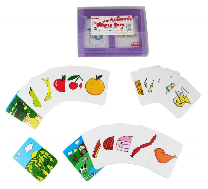 Cada juego contiene 24 tarjetas de plástico serigrafiado con bonitos dibujos para facilitar la compresión y presentado en un maletín transparente de plástico.